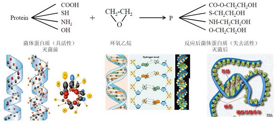 環(huán)氧乙烷在作用時,其環(huán)狀結(jié)構(gòu)斷裂,經(jīng)羥化,與菌體內(nèi)蛋白質(zhì)上的氨基、羧基、羥基等活性基團烷基化作用,使酶代謝過程發(fā)生障礙,從而破壞菌體的新陳代謝,造成微生物死亡,達到殺菌的目的。