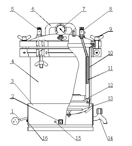 3、容器蓋上安裝有安全閥和放氣閥,當(dāng)蒸汽壓力超過0.165Mpa時(shí),安全閥能啟動(dòng)釋放過高壓力,使之達(dá)到了使用上的安全,可靠,壓力表能顯示工作壓力和相對(duì)溫度,便于參照掌握滅菌時(shí)間。