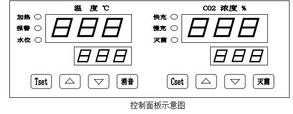 (2)待溫度達(dá)到設(shè)定值后,將二氧化碳鋼瓶開啟,(開啟前,減壓閥應(yīng)盡量擰松,防止減壓閥輸出壓力過高導(dǎo)致輸氣橡皮管爆裂?。p壓閥上進(jìn)氣壓力表指示鋼瓶內(nèi)二氧化碳壓力,緩慢的順時針擰減壓閥旋鈕。使減壓閥輸出壓力指示為0.05Mpa,指針處于刻線中間。此時在控制面板上設(shè)定所需二氧化碳濃度(出廠時調(diào)整為5%),CO2充氣指示燈亮,此時即有二氧化碳進(jìn)入室內(nèi)。隨著濃度升高,LED顯示出二氧化碳濃度值,到設(shè)定值時粗調(diào),電磁閥切斷,切換到細(xì)調(diào)補(bǔ)氣。