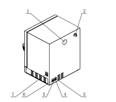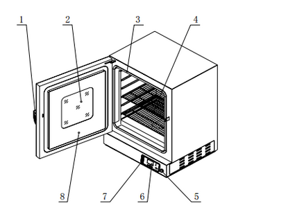 1.門把手 2.觀察窗 3.密封圈 4.擱 板 5.電源開關(guān) 6.操作及顯示界面 7.流量計(jì) 8.箱門