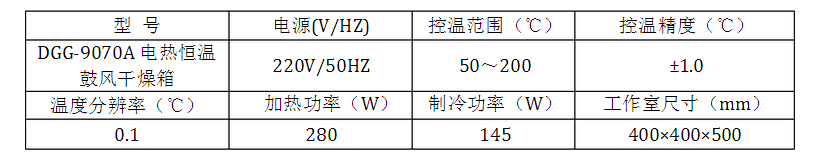 該設(shè)備采用高精度微機(jī)控溫儀,具有響應(yīng)快、超調(diào)小、精度高的特點(diǎn),使用輕觸按鍵設(shè)定參數(shù),加熱恒溫系統(tǒng)由裝有離心式葉輪的德G優(yōu)質(zhì)風(fēng)機(jī)、電加熱器、合適的風(fēng)道結(jié)構(gòu)和溫度控制器組成。當(dāng)接通干燥箱電源時(shí), 風(fēng)機(jī)即同時(shí)運(yùn)轉(zhuǎn),直接將位于箱內(nèi)底部的電加熱器產(chǎn)生的熱量通過(guò)風(fēng)道向上排出,經(jīng)過(guò)工作室內(nèi)干燥物品再吸入風(fēng)機(jī),以此不斷循環(huán),從而使工作室內(nèi)溫度達(dá)到均勻。 4.2 設(shè)備主要參數(shù)
