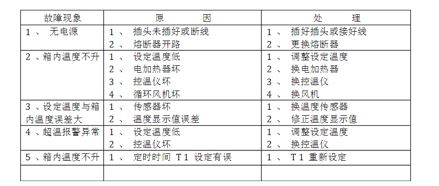 4.7.2 如果運(yùn)行溫度過(guò)高,務(wù)必等到設(shè)備冷卻以后再取出物品。 4.7.3 箱內(nèi)物品放置切勿過(guò)擠,須流出空間,以利熱空氣循環(huán)。 4.8 維護(hù)保養(yǎng)